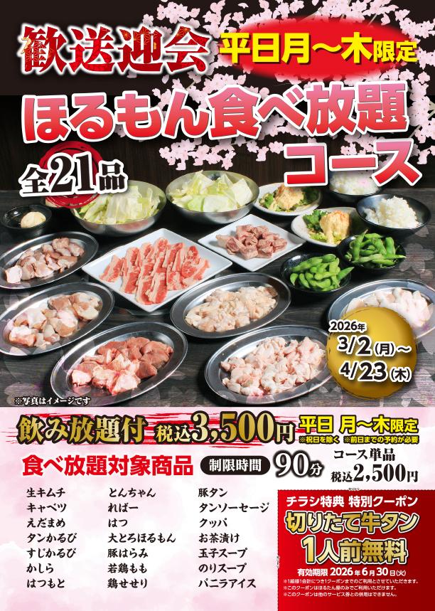 🐷ホルモン食べ放題コース2,500円🍺飲み放題付は3,500円
